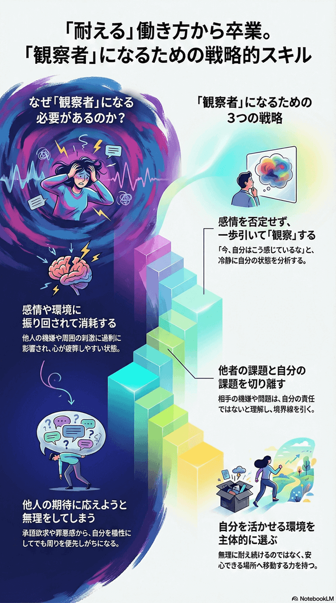 自分自身の感情や周囲の状況を、ただ耐えるのではなく「観察者」として客観的に捉える技術について解説します。これは、感情を否定したり、人間関係から逃げたりするための消極的な手法ではありません。